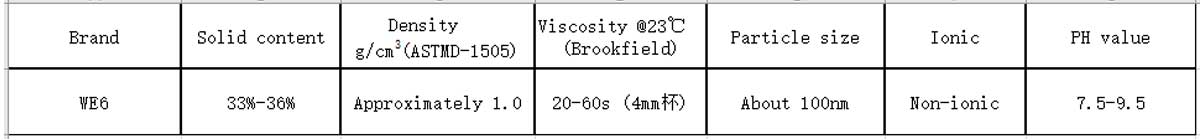 Product characteristic: WE6 is a non—ionic oxidation polyethylene wax emulsion produced by High density oxide polyethylene wax emulsifying under high pressure, with relative balance of hardness, toughness and elasticity. Have high compatibility and stability; Have FDA verification.