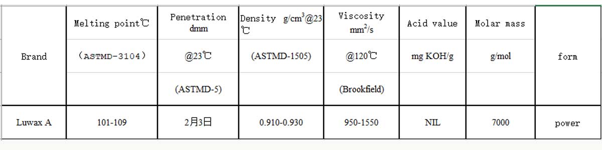 Product characteristic: Luwax A is LDPE wax, manufacture process is high temperature 、high pressure polymerization , molecular weight about at 6000. Luwax A have good thermal stability , low melting viscosity ,good liquidity .It’s have good affinity with pigment, good wetting and dispersing for pigment . So recommend to masterbatch and as a lubricant for plastic processing industry. Having FDA verification ,and widely used in inner packing of food.